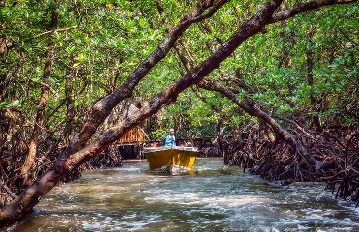 Calm boat ride through golden reflections of the mangroves and backwaters.